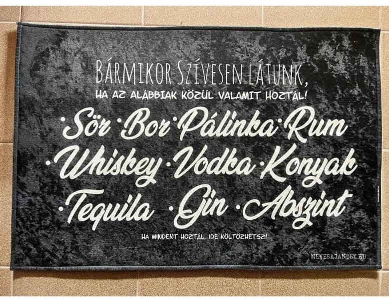 Lábtörlő- Vicces ajándékFelirat: Bármikor szívesen látunk, ha az alábbiak közül valamit hoztál! Sör Bor Pálinka Rum Whiskey Vodka Konyak Tequila Gin Abszint Ha mindent hoztál, ide költözhetsz!Méretei: 60cm * 40cmVastagsága:4mmAnyaga:100% polyester, csúszásgátlós gumi aljjal. Felülete fényes, bársonyos hatású, a szín árnyalatokban eltérhet a képen látható mintától. Mosógépben mosható, színe, mintája nem fakul. Fürdőszoba kilépőnek is használható. Vicces ajándék minden alkalomra!Vicces mintájú lábtörlő, ami szülinapra, névnapra is tökéletes ajándékötlet, de alkalom nélkül is ajándékozhatod.