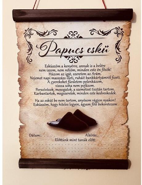Pergamen - Papucs eskü - Ajándék esküvőre - Vicces ajándékFelirat: Esküszöm a kenyérre és annak is belére, nem iszom nem nőzöm, minden este én főzök! Húzom az igát szeretem az Arám. Nejemet napi masszás illeti, ruháit bankkártyámról fizeti. A gyerekeket fürdetem-pelenkázom , vissza soha nem pofázom. Porszívózok. , mosogatok, a szemetest tisztán tartom. Karbantartok, megszerelek , minden este kedveskedek. Ha az esküt be nem tartom, anyósom vágjon nyakon! Esküszöm, hogy hiteles legyen ágyam fölé bekeretezem.   Dátum, Aláírás, Előttük mint tanúk előtt: Mérete: 20 x 28 x 1 cm