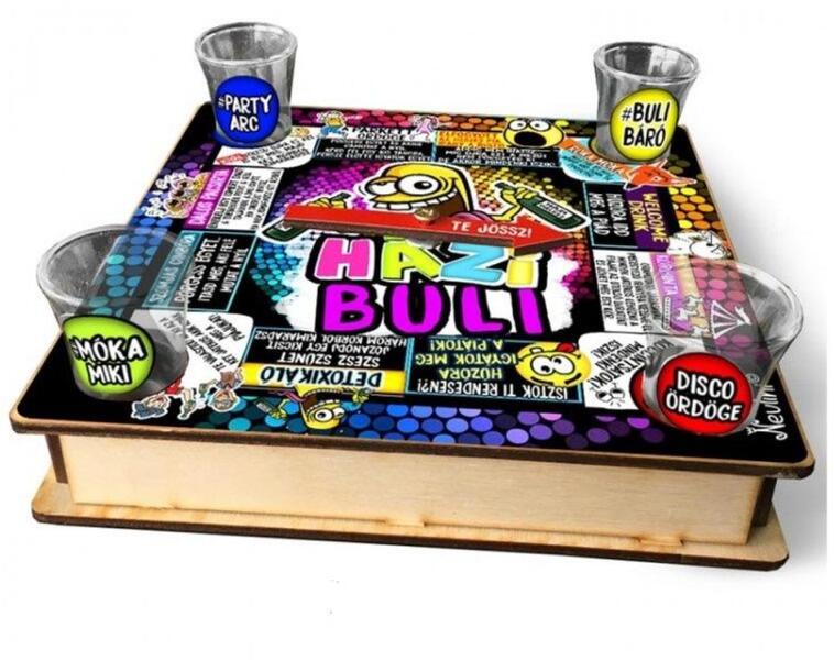 "Házi buli. " Ivós társasjáték. Vicces ajándék ötletek. Társasjáték avagy party beindító ivászat. Fából készült vicces, italozós társasjáték, 4 db pohárral. Neked csak az alkoholról kell gondoskodnod, és töretlen lesz a jókedv!Ajándék ötlet: rokonnak, havernak, barátnak, ismerősnek, bárkinekMérete: 18 x 18 cm Anyaga: fa, üveg A poharak űrtartalma: 2cl