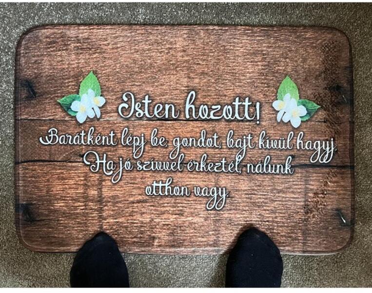 Vicces lábtörlő Isten hozott - Ajándék ötlet családtagoknak -  Vicces ajándékFelirat: Isten hozott! Barátként lépj be, gondot , bajt kívül hagyj. Ha jó szívvel érkeztél nálunk otthon vagy.  Mérete:60x40cmAnyaga: polyester, csúszásgátlós  aljjal. Felülete fényes, bársonyos hatású, a szín árnyalatokban eltérhet a képen látható mintától. Használata: beltéri Tisztítása: puha kefével és oldószermentes mosószerrel.