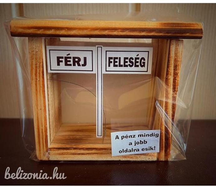 Vicces persely házastársaknak   Vicces persely férfi és női feliratokkal. Feleség, férj  bármely részén dobjuk be a pénzt, az mindig a női részbe kerül.  Fából készült ajándék tökéletes ajándék esküvőre, házassági évfordulóra. Mérete: 13 cm x 9 cm x 10 cm. Anyaga: fa + üveg.